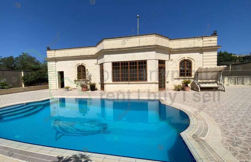 Located in Santa Maria Estate, Mellieha, this 1,475 sqm bungalow offers a spacious layout with three bedrooms, multiple living areas, a front balcony, back terrace, and a four-car garage with a bathroom. A separate two-bedroom flatlet adds flexibility. The outdoor area features a pool, deck, garden, and another bathroom. A rare find in a prime location.