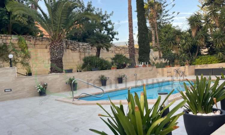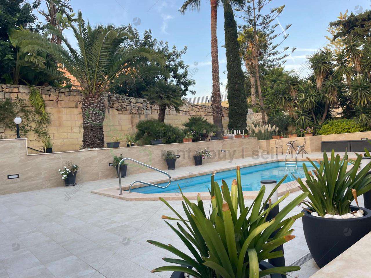 This fully detached villa, located at High ridge, boasts beautiful surrounding .gardens and a spacious driveway that can accommodate up to 3-4 cars. Additionally, there are two lock-up garages located side by side. The property is now available for occupancy and features a large pool and BBQ area. Inside, the villa includes an entrance hall, a formal living and dining room with a cozy fireplace, a terrace, and a study area. The dining room is connected to the kitchen, which overlooks the pool area, and a separate living room. A restroom and washroom are also included on this floor. On the upper floor, you will find two generously sized double bedrooms with en-suite bathrooms. There is also a landing area, which can be used as an additional living room, two more bedrooms, and a study. The terraces located on this floor offer stunning views of the pool area and the front entrance. This property is elegantly finished with a classic touch and features a charming courtyard in the middle, allowing for plenty of natural light to fill the home. Price includes gardener and pool attendant every week. Please contact the agent to schedule a viewing.