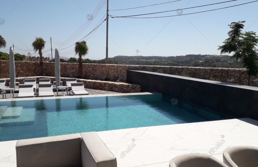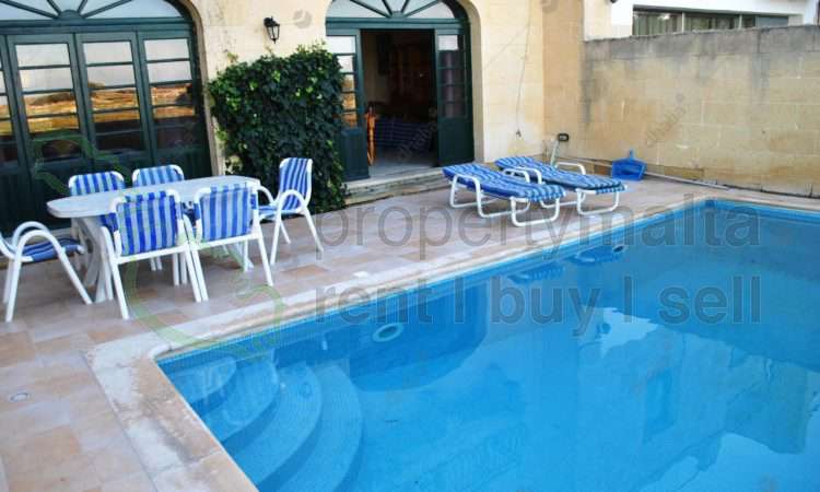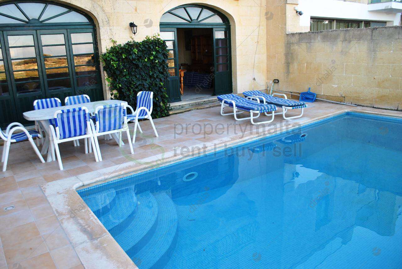 Fabulous house of character in ‘Birbuba’, an extremely tranquil ‘cul de sac’ on the outskirts of the village Gharb and just a few minutes’ walk from the famous San Dimitri chapel. The farmhouse has been built using traditional Maltese architectural features like wooden beams, limestone arches, stone floors and wrought iron. Swimming Pool faces West giving spectacular views of the sunsets. The surrounding terrace is ideal to lounge around and has plenty of space for BBQ’s as well. The pool is 5.25mt x 2.75mt (Shallow part is 1.2mt deep and deep end is 2.2mt deep). There is an outside shower near pool. The kitchen leads into a large sitting/dining room that overlooks the pool/BBQ area. An internal staircase leads to four bedrooms all with balconys enjoying views and a bathroom. Available for long let.