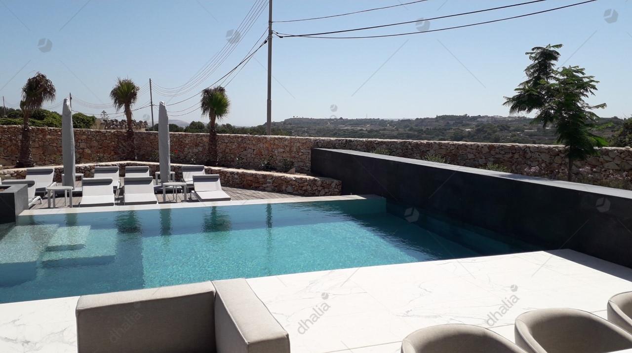 New, designer-styled, four-bedroom, five-bathroom country-house situated on 2.5 tumoli of land, located in this quiet upmarket residential area, surrounded by gardens, hills, and the countryside. Upon entrance, one will find the main living area of the house, with a brand new white fully-equipped kitchen and black-marble bar on your left and the main living/tv area straight ahead. The living/TV area is fully furnished including WiFi, a 60-inch television, a fireplace, and huge sliding windows allowing lots of natural light into the room and the feeling of being outside while actually being indoors. Leading out from this main room are two independent fully-fitted bedrooms each with a double bed, a third bedroom also with a double bed, and with an en-suite bathroom another bathroom with a shower also serves as the bathroom of the pool area as it has a second door leading out.