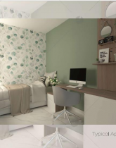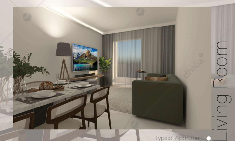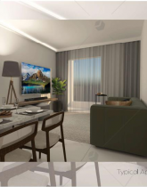 A two-bedroom apartment measuring approximately 90 square metres. The layout consists of an open plan kitchen/living/dining area leading to a front balcony, main bathroom, a master bedroom with en suite, a second bedroom and a back balcony. The property is being sold completely finished including doors and bathrooms. Optional garages are also available. Freehold.