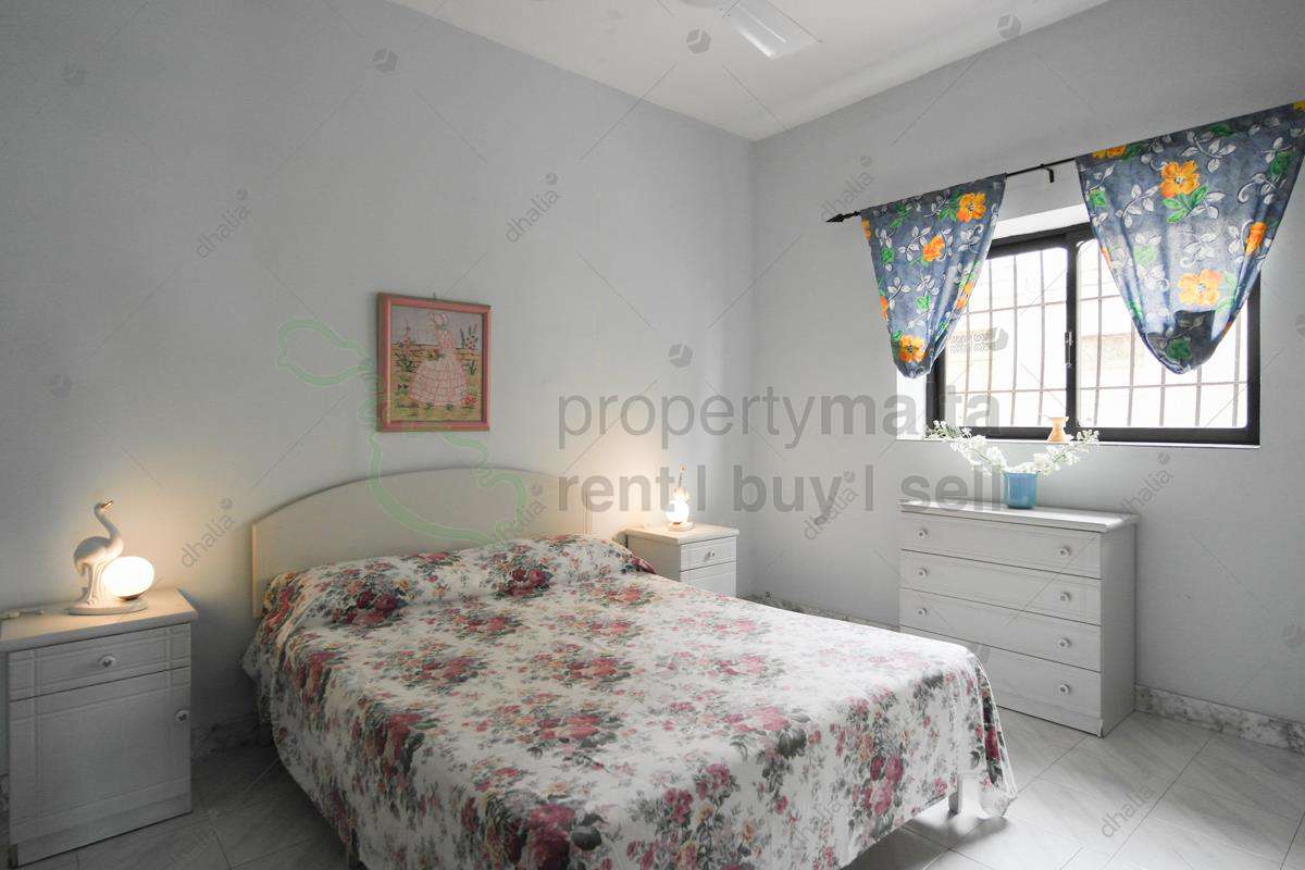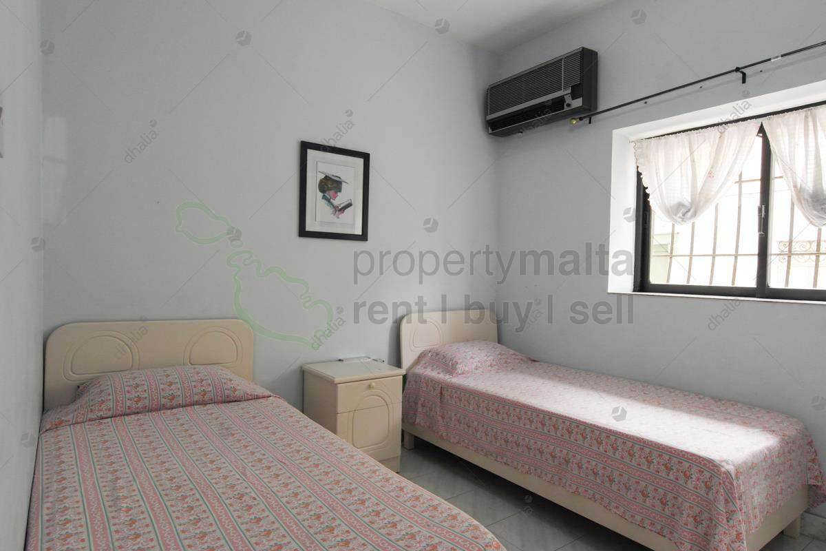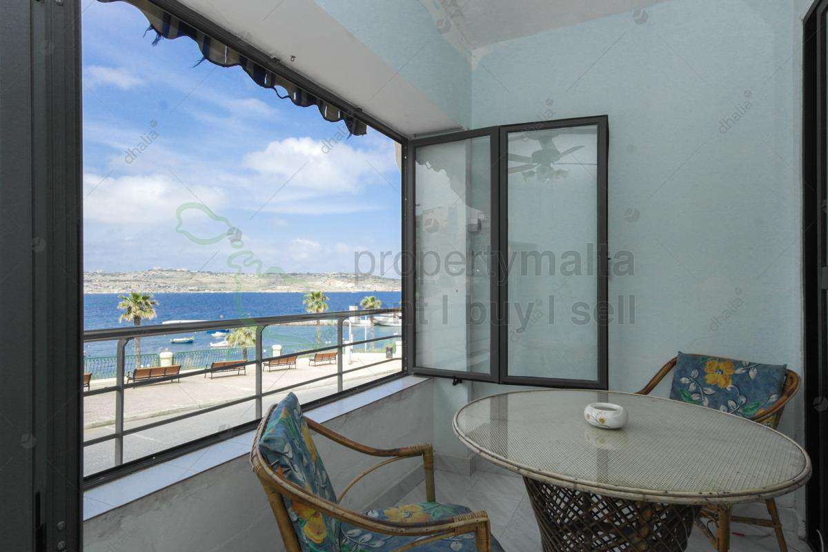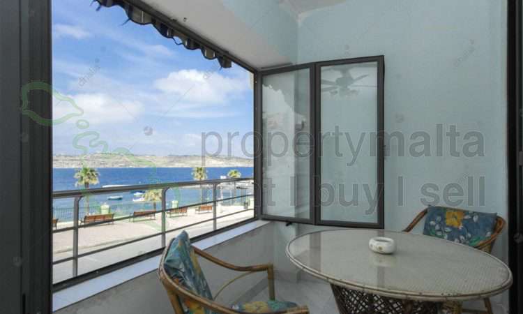 A corner seafront two-bedroom apartment situated in Bugibba, close to all amenities. The layout is in the form of an entrance hall, an open plan kitchen/living/dining leading to a front balcony with open sea views, two double bedrooms, and a bathroom.