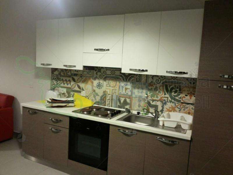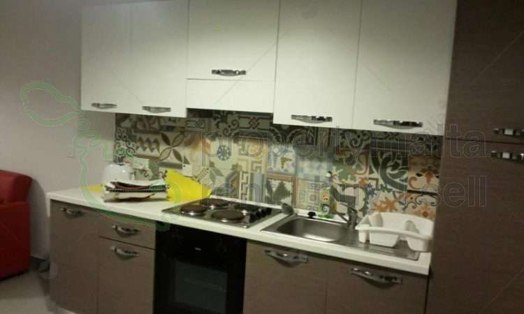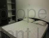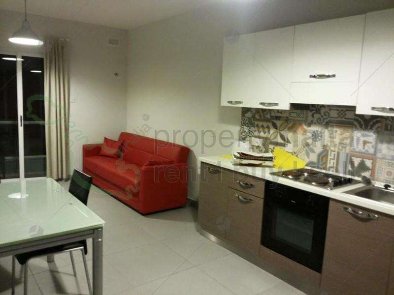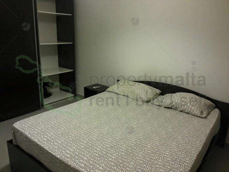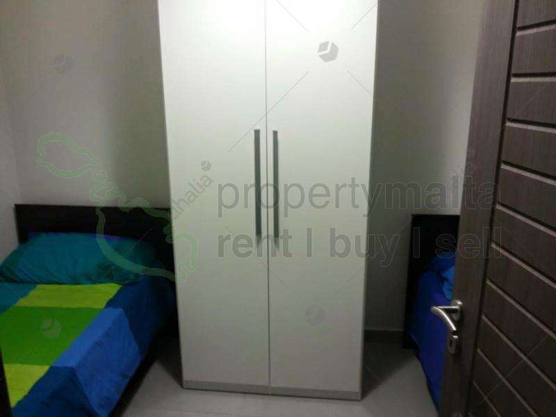 A modern furnished two-bedroom apartment close to the seafront. The layout includes a combined kitchen/living/dining leading to a front balcony, a main shower, one double, one single bedroom, and a back balcony.