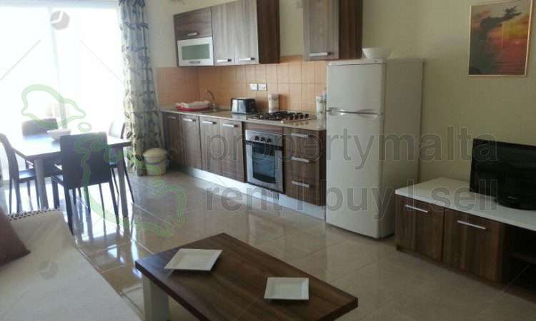 Well-furnished two-bedroom apartment in Bugibba. The property has an open-plan kitchen/living/dining area, toilet en suite, bathroom, and a front balcony.