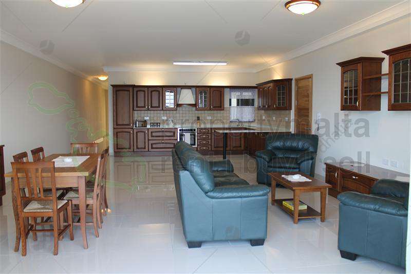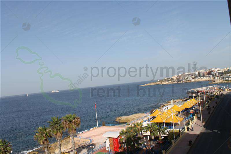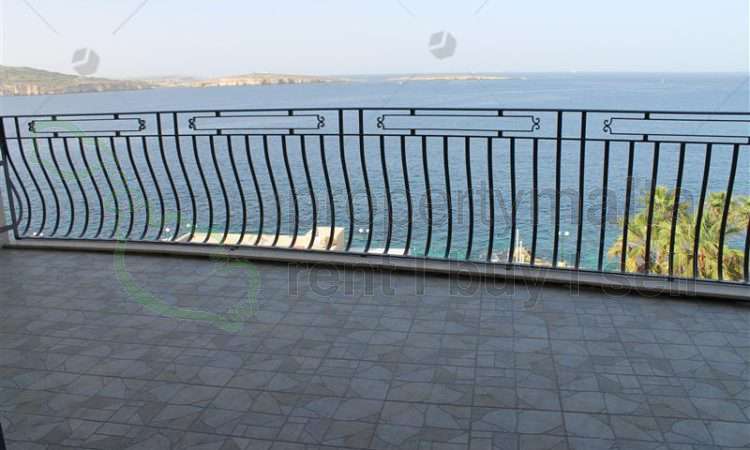 Seafront, nicely furnished three-bedroom fully air-conditioned apartment in Bugibba. The property consists of a very large combined kitchen/living/dining leading to a terrace facing stunning sea views, three double bedrooms, a shower en suite, and a bathroom. A one-car garage is also included in the price.