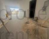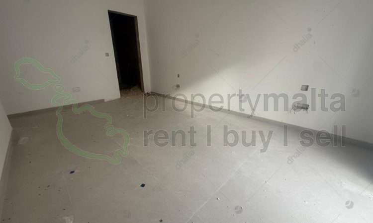A finished, two-bedroom apartment on the second floor, located in Fgura. The layout features an open-plan kitchen, living, and dining area leading to a front balcony, a main bedroom with an ensuite shower, a second bedroom, and a back balcony.