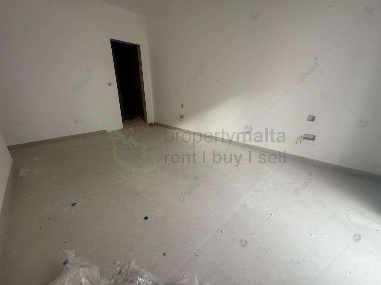 A finished, two-bedroom apartment on the second floor, located in Fgura. The layout features an open-plan kitchen, living, and dining area leading to a front balcony, a main bedroom with an ensuite shower, a second bedroom, and a back balcony.