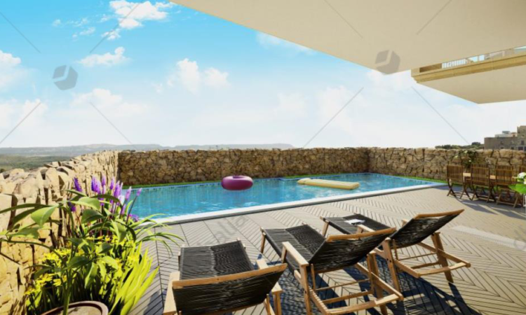 New on the market is this new development in Qala consisting of only ten units with communal pool while enjoying breathtaking amazing views. This spacious ground floor apartment is truly an excellent, future proof investment for the discerning property owner. This property consists of a well sized kitchen/dining/living room combined, two bedrooms, two bathrooms, a private pool and back terrace. Finished to very high standards including air-conditioning, false ceilings, fire alarm system, sound insulation and much more. This block will also benefits from the developer`s signature zero CO2 concepts to make it as water and energy-efficient as possible, with each property having its own PV system. Each garage comes with an Electric Vehicle charging point and remote-controlled door and access as standard.