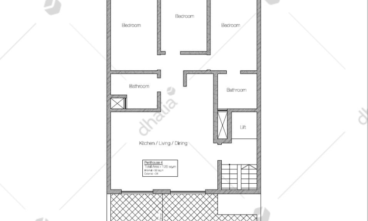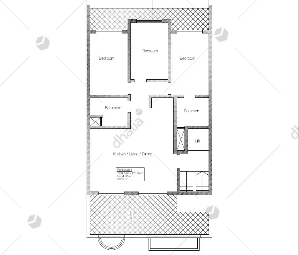 This third floor apartment part of a small block of only four units. This property comprises an open-plan kitchen/dining/living room, three bedrooms, two main bathrooms, and two large terraces. The property is being offered in shell form with highly finished front apertures, railings and balconies.