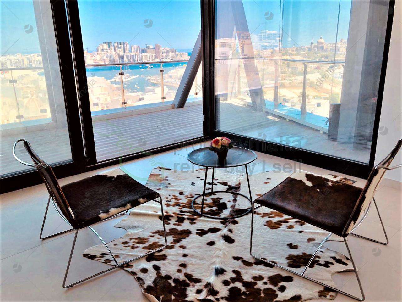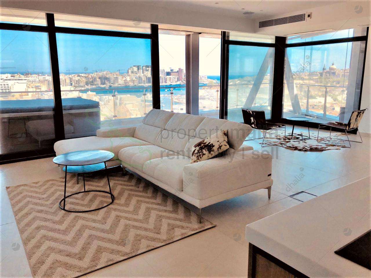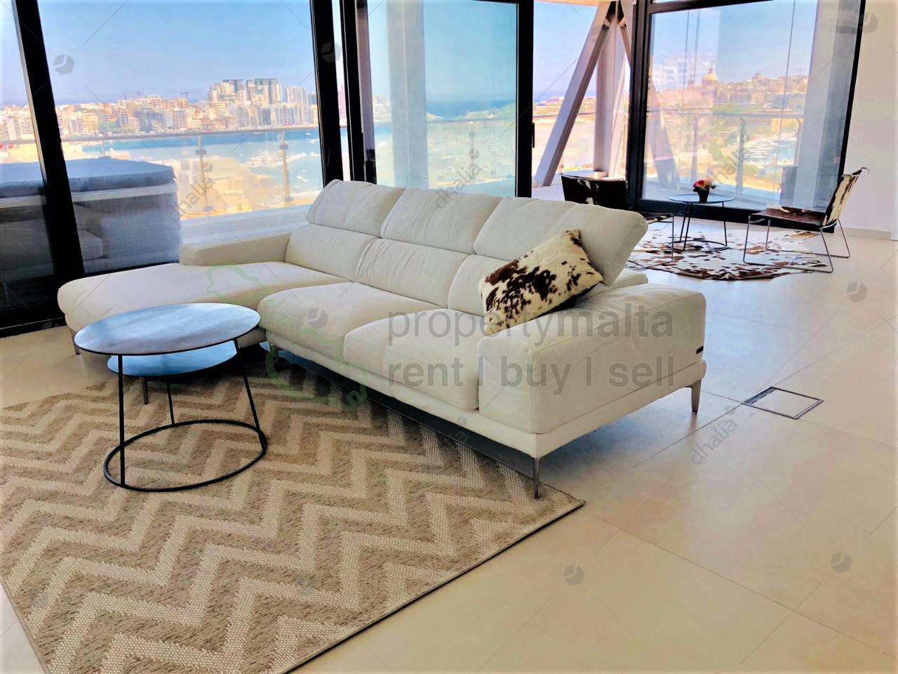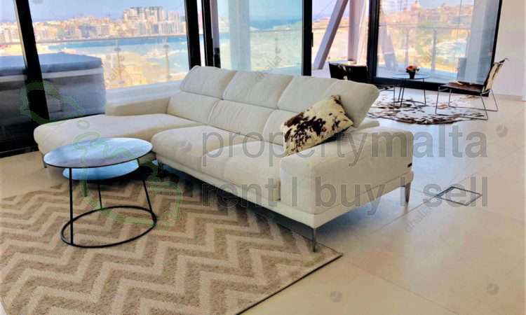 Luxuriously finished, 11th-floor apartment situated in the up and coming area of Gzira with a fresh modern take. This property consists of 175 square metres of internal living area and 100 square metres of external space and enjoys views of Manoel Island, Sliema Creek and Valletta. The layout consists of a large kitchen/living/dining area, three double bedrooms all with ensuite facilities, guest toilet, boxroom and laundry room. Complementing this property are two separate good-sized wrap around terraces, with Jacuzzi also ideal for entertaining, fully equipped and air-conditioned. Furthermore, car space is also included.