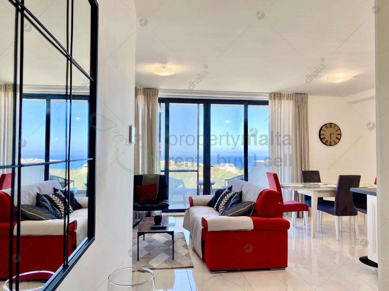 A modern, bright, and spacious enjoying beautiful distant sea views and spacious two-bedroom apartment in Mellieha. The apartment consists of an open-plan living/dining area, a kitchen (equipped with a dishwasher), two double bedrooms, an ensuite, a family bathroom, a box room, a front balcony, and another balcony at the back leading off from the two-bedrooms. Complementing this property is a one-car lock-up garage.