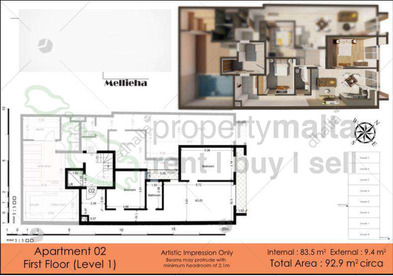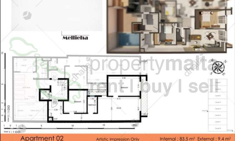 A great opportunity to acquire a property on one of the highest points of Mellieha, either as a home or as a rental investment. Twelve apartments in all, offered finished excluding bathrooms and doors, with the upper floors enjoying distant views beyond Santa Marija Estate. This small block will have a communal heated indoor pool, whereas the penthouses will also have a private pool and deck area. Accommodation varies between one, two and three-bedroom apartments which have either one or two bathrooms, depending on the size, with the price varying accordingly. Since still on plan, there is also an early buyer offer and an additional discount if the deposit is higher than required at the promise-of-sale stage.