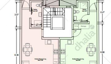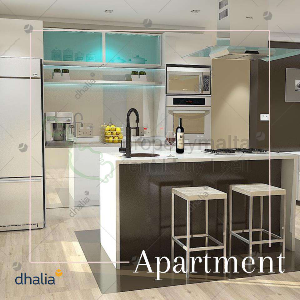 A first-floor one-bedroom apartment is being sold finished, including doors and the bathroom. The layout comprises an open plan kitchen/living/dining leading to a front balcony, a main bathroom, and a master bedroom. It is freehold.