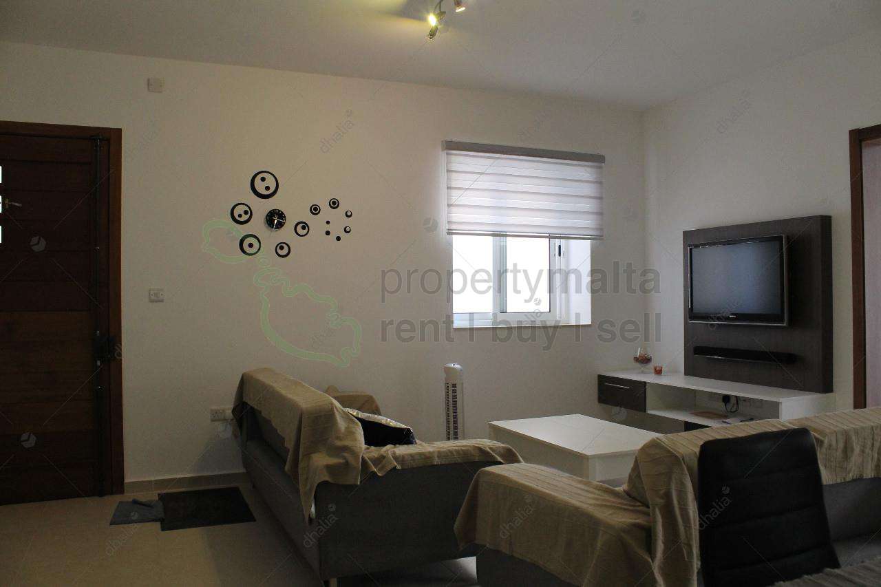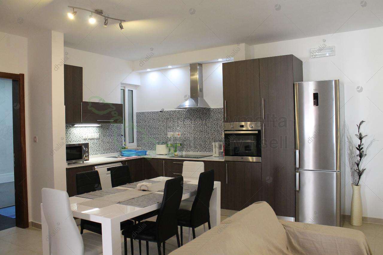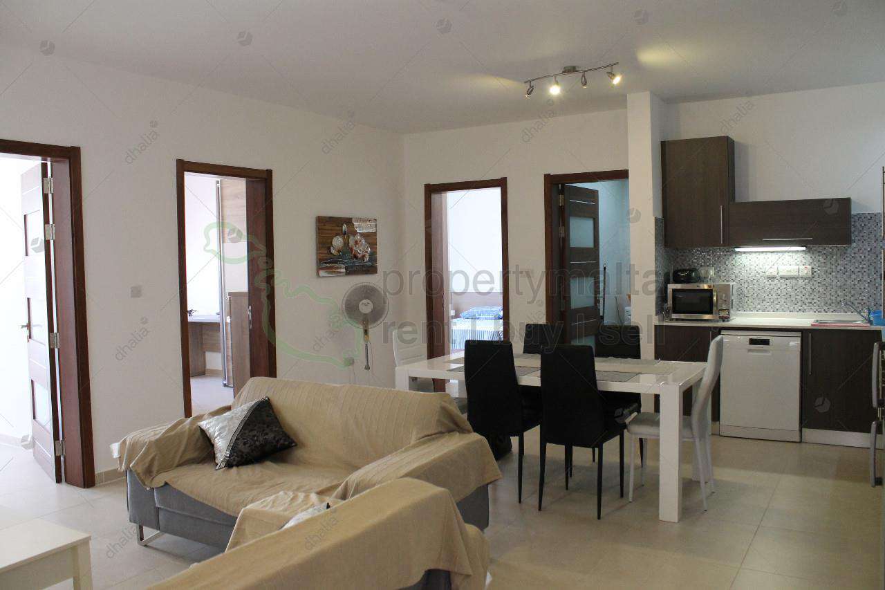 Bright and spacious three-bedroom apartment in a smart block in Qawra. The property comprises an open-plan kitchen/living/dining area, a bathroom, and three double bedrooms, and a front balcony.