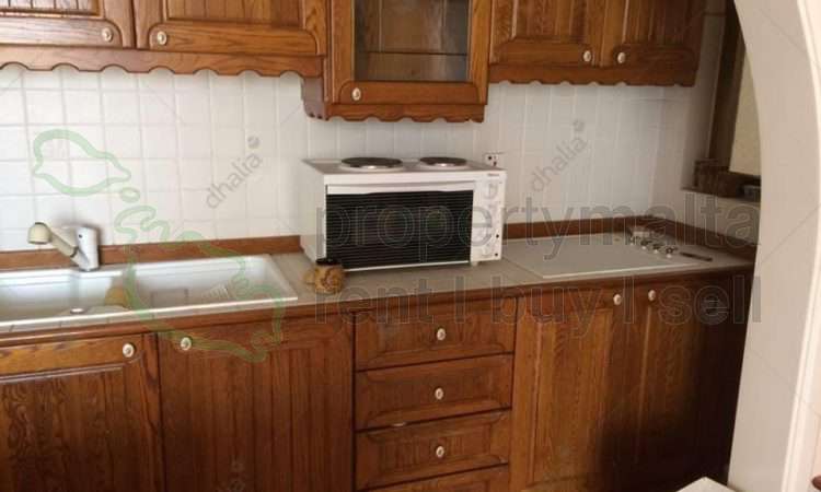 A very spacious two-bedroom apartment in Qawra. The property consists of an open-plan kitchen. dining, living area, main bathroom, and a front balcony with side sea views.