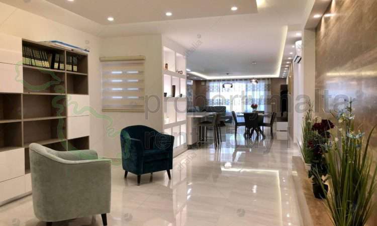 Luxurious, modern three-bedroom fully airconditioned, fourth-floor apartment located close to all amenities in Qawra. The property consists of a large open-plan kitchen with a dishwasher and a breakfast bar/living/dining area with a large front balcony, the main bathroom, box-room, laundry room, and three double bedrooms (main with shower ensuite and a balcony). Finished to high standards and offered fully equipped. Served with lift. Complementing this property there is a lock-up garage included.