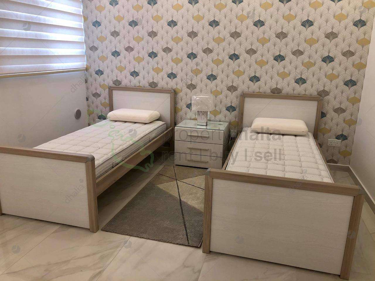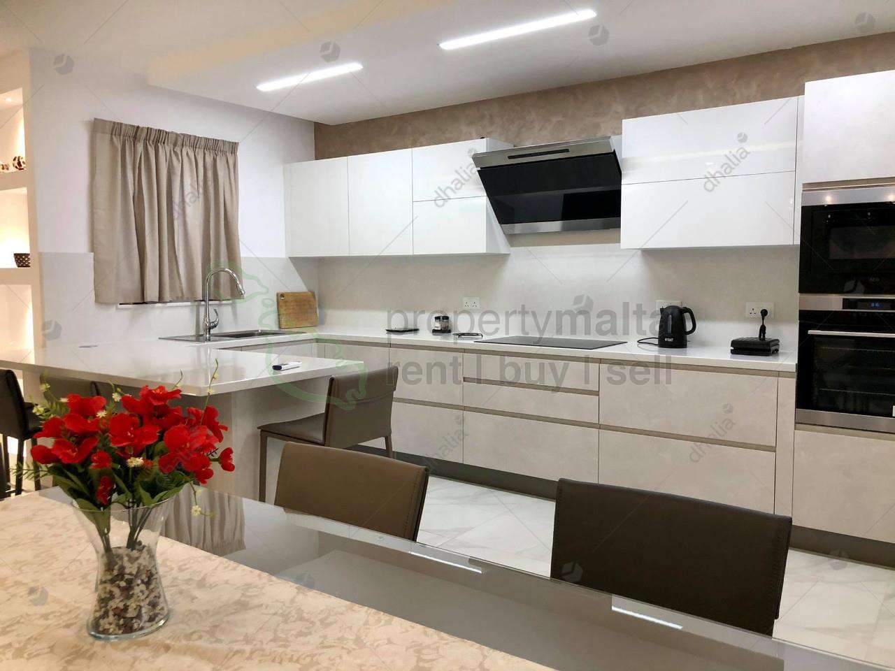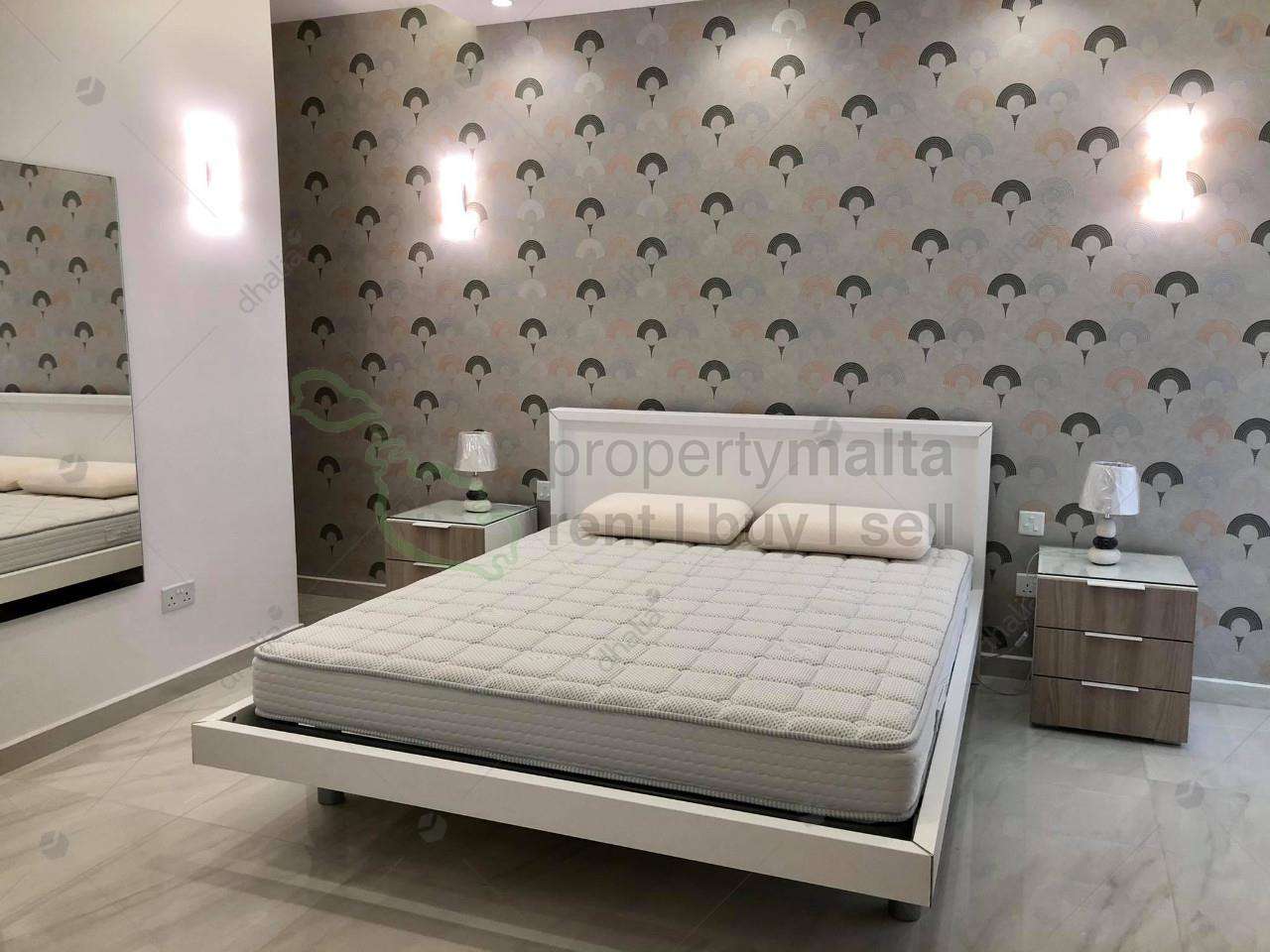 Luxurious, modern three-bedroom fully airconditioned, fourth-floor apartment located close to all amenities in Qawra. The property consists of a large open-plan kitchen with a dishwasher and a breakfast bar/living/dining area with a large front balcony, the main bathroom, box-room, laundry room, and three double bedrooms (main with shower ensuite and a balcony). Finished to high standards and offered fully equipped. Served with lift. Complementing this property there is a lock-up garage included.