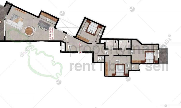An opportunity to purchase a three bedroom apartment, overlooking a peaceful green area with stunning countryside views. The layout features an open-plan kitchen, living, and dining area, leading to a spacious front terrace, a main bathroom, and three double bedrooms (main with an en suite and a back balcony). Optional garages are also available. The property is being sold finished, excluding doors and bathrooms.