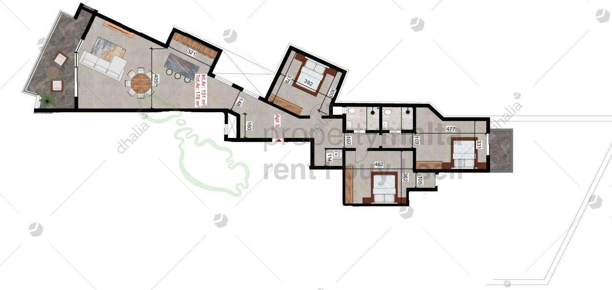 An opportunity to purchase a three bedroom apartment, overlooking a peaceful green area with stunning countryside views. The layout features an open-plan kitchen, living, and dining area, leading to a spacious front terrace, a main bathroom, and three double bedrooms (main with an en suite and a back balcony). Optional garages are also available. The property is being sold finished, excluding doors and bathrooms.