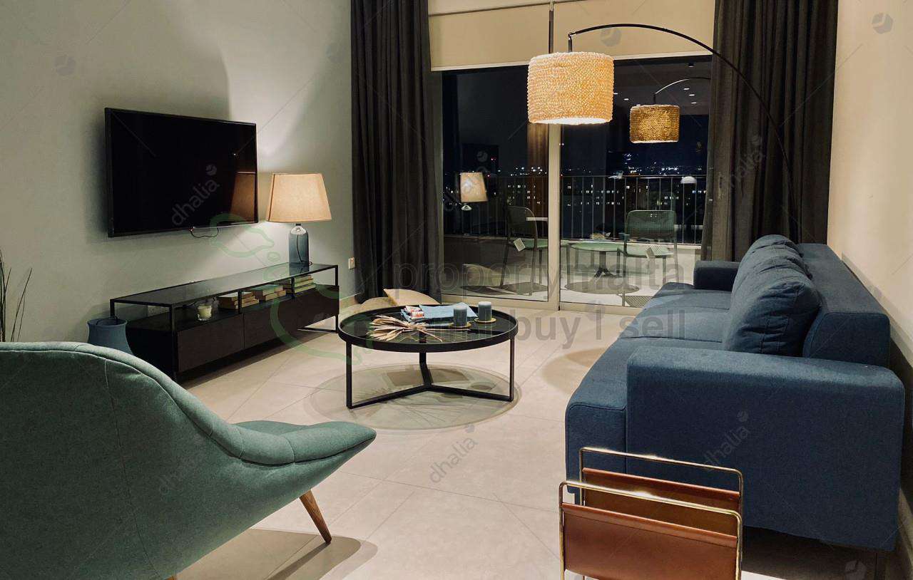 A three-bedroom apartment has an open-plan kitchen/living/dining room leading to a front balcony, three double bedrooms, a guest toilet, and a boxroom.