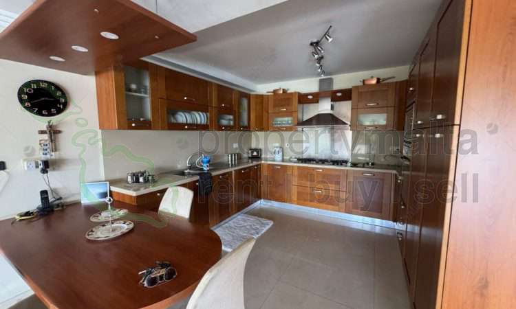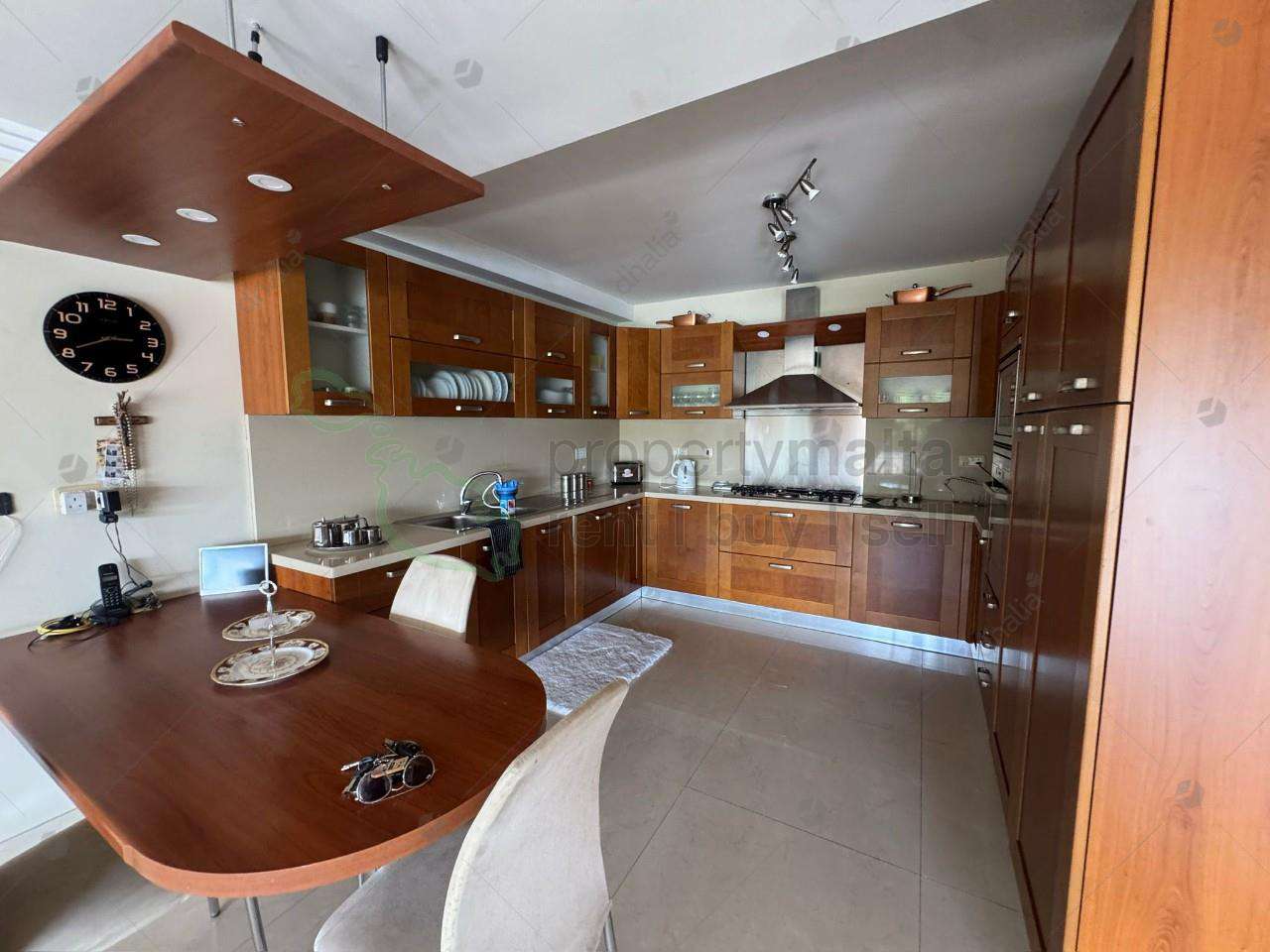 A wide fronted 195square metre seafront apartment on the sought-after sunny side of Sliema enjoying sea views from all the living areas of this lovely home and its spacious terrace. Entrance from ground floor directly to the common areas and the elevator where no steps are present from the pavement to the elevator, making it ideal for anyone with mobility difficulties. The apartment`s layout consists of an entrance hall leading onto the bright and airy open-plan kitchen, living, dining room. This open plan living area flows seamlessly onto the large terrace, a perfect setting for entertaining or simply relaxing while taking in the views. The sleeping quarters include two spacious double bedrooms both of which include their own ensuite bathroom. A main bathroom, boxroom/laundry provide additional functionality and convenience. This residence is being sold partly furnished, allowing for an easy and immediate move-in together with two interconnected car spaces, a valuable asset in this prime location.