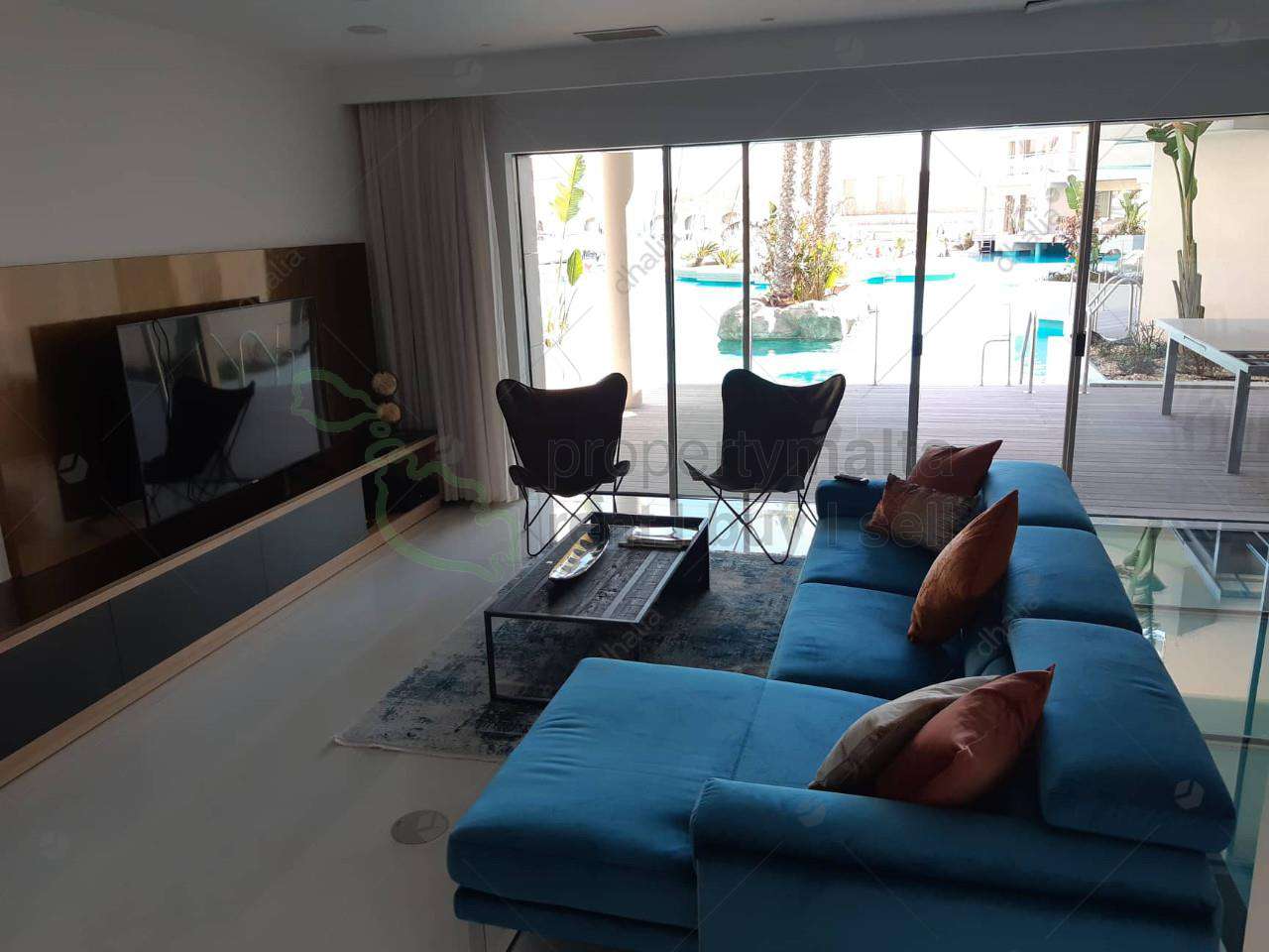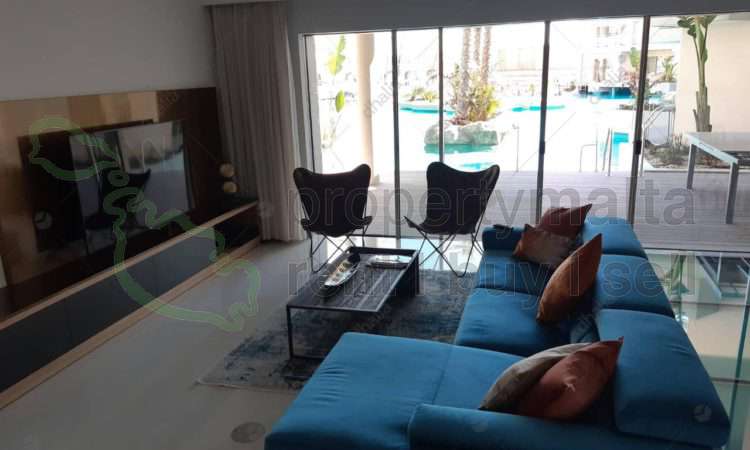 Two-bedroom apartment situated in St Julians. This apartment is larger than usual and enjoys communal pool access from the living room and the main bedroom. Layout comprises a big kitchen/living/dining area with a bar and a massive terrace ideal for entertaining, two double bedrooms with walk-in wardrobe and with shower ensuite. Property also enjoys a laundry room and comes fully air conditioned and equipped.