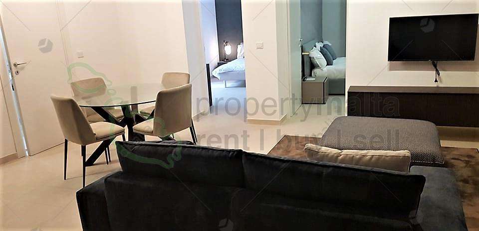 Designer-finished and furnished first-floor two-bedroom apartment situated just off the St Julians Balluta Seafront and all amenities. The property consists of a welcoming hallway leading to an open kitchen/living/dining area, main bathroom, two double bedrooms and main having ensuite facilities. The property comes fully equipped and air-conditioned throughout. Served with lift.