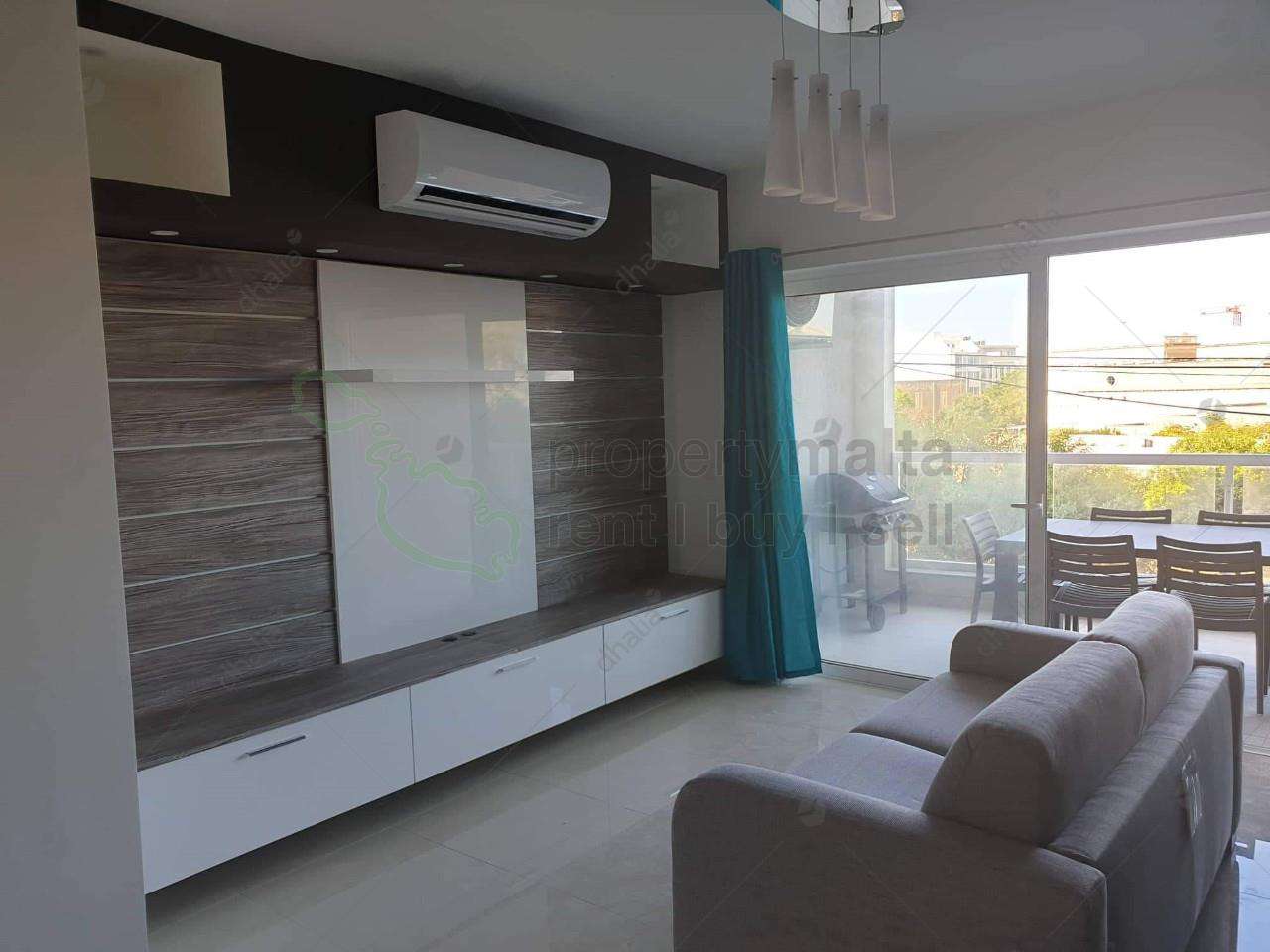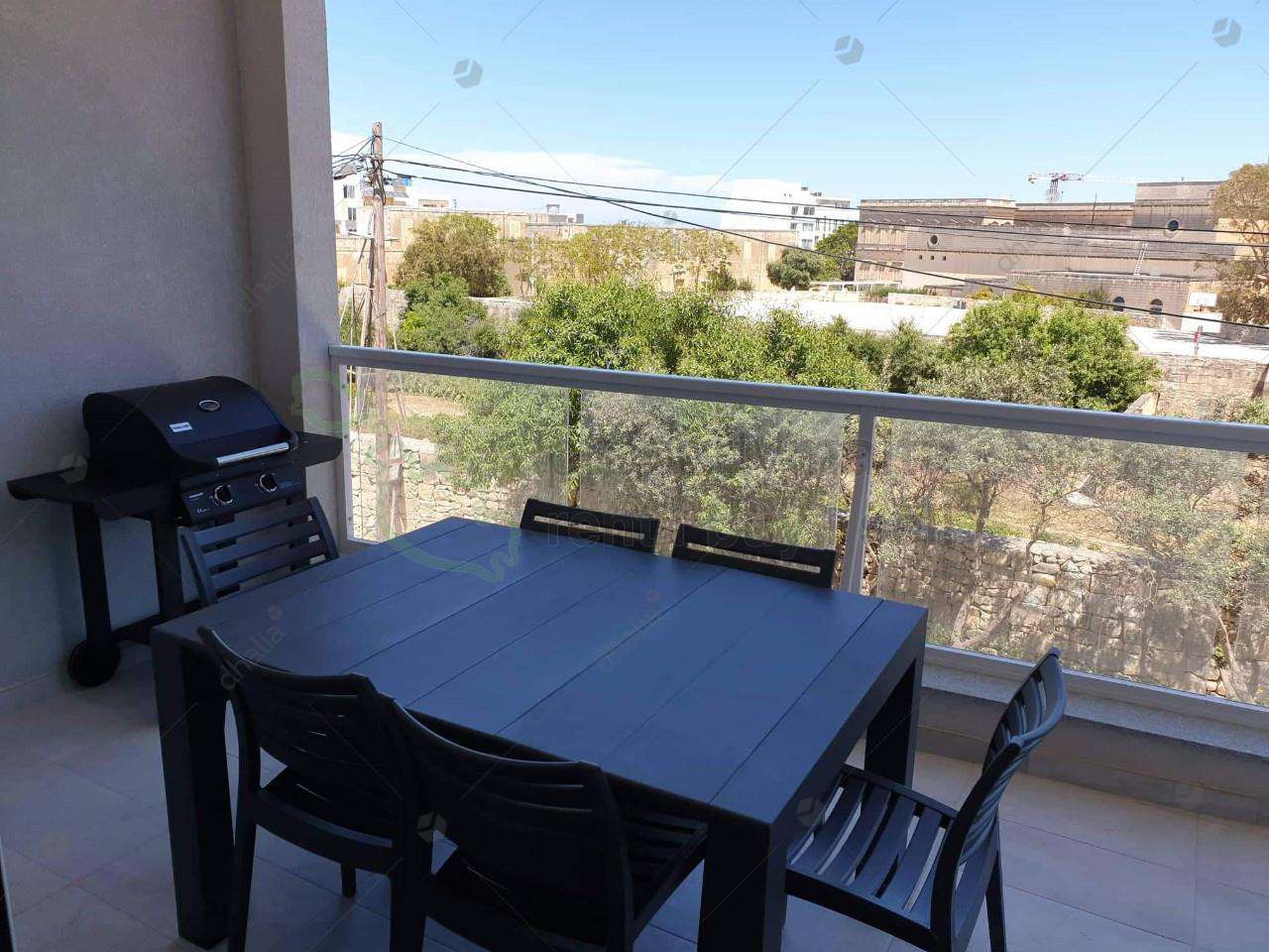 A luxuriously finished apartment situated in a sought-after area on top of St. Julian`s hill, close to Balluta Bay and Portomaso/Paceville. Upon entrance, there is a spacious open-plan kitchen/living/dining area consisting of top-of-the-range, built-in appliances, a 4K 55 inch LED TV and a sofa bed leading onto a sizeable, main bathroom, a contemporary master bedroom enhanced by a four-piece wardrobe and a good-sized ensuite shower room and the second bedroom. Both bedrooms lead onto a long-winded balcony set at the back of the apartment, which also leads to a small utility/laundry/storage room. A large terrace/BBQ area with outside furniture and a BBQ complements this property. Other unique features of this property are the open space and the distant views from the terrace and the kitchen window. The apartment forms part of an exclusive communal block of four apartments and two penthouses. Included in the price; is an interconnecting, two-car, basement garage with a remote operated door and a convenient lift just opposite the garage door. The garage has water and electricity and ample space for storage.