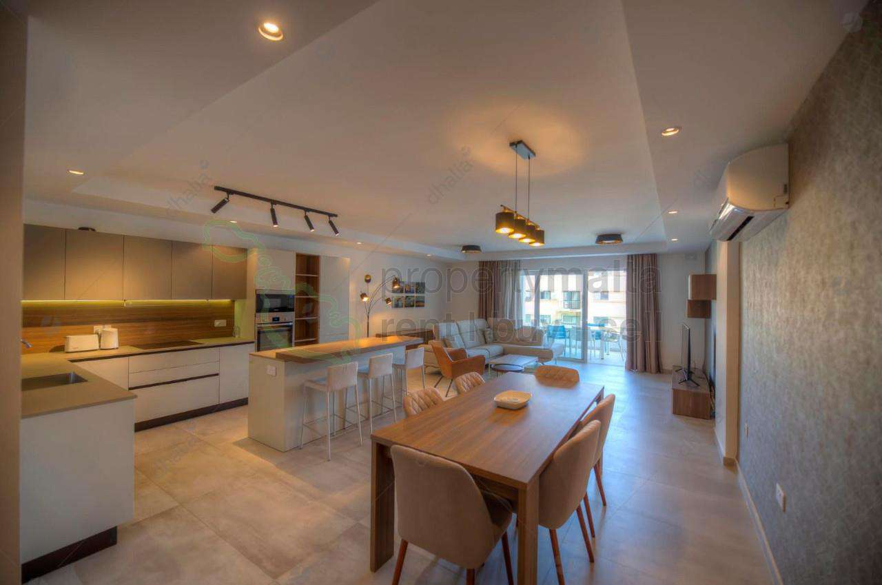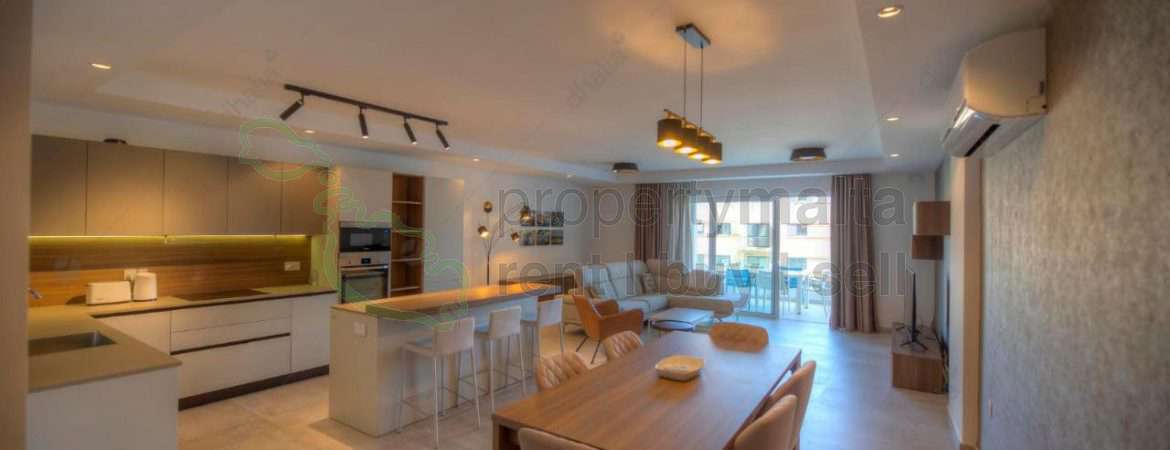 Luxuriously finished three bedroom apartment situated in St. Julians, minutes away from the beach and all amenities. Property comprises of a spacious open plan kitchen/ living/ dining, leading onto a wide terrace and three double bedrooms (main bedroom enjoying en suite facilities) , main bathroom and boxroom. Property is fully equipped, fully air conditioned and ready to move into.