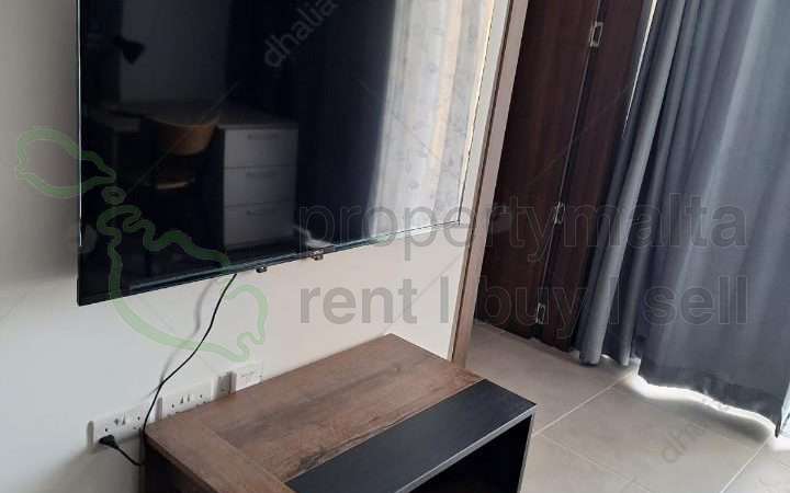 A two-bedroom apartment in St Paul`s Bay consisting of an open-plan kitchen/dining/living area leading to a front balcony, a main bathroom, an ensuite, and a back balcony.