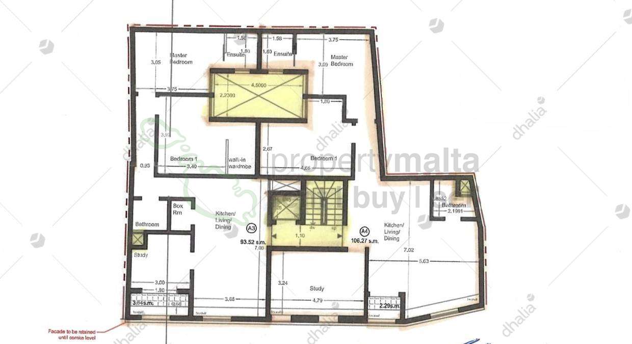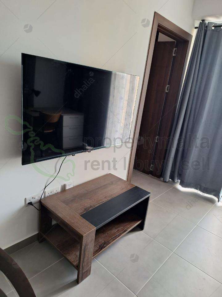A two-bedroom apartment in St Paul`s Bay consisting of an open-plan kitchen/dining/living area leading to a front balcony, a main bathroom, an ensuite, and a back balcony.