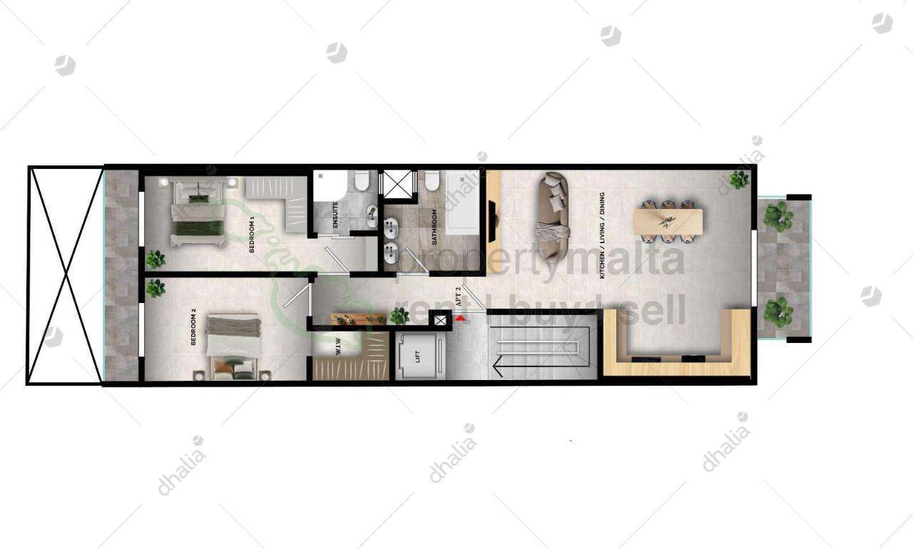 Brand new two-bedroom apartment in a very sought-after area in Swieqi. A nice square layout and larger than usual comprising a large kitchen, living, dining, complemented with a front terrace, two double bedrooms and two bathrooms, with the main having an en-suite. Currently on plan and will be sold finished, excluding bathrooms and internal doors. The property will be sold freehold and completion date is end of 2026.
