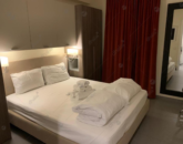 kitchen, living and dining area. The layout includes a spacious bedroom,