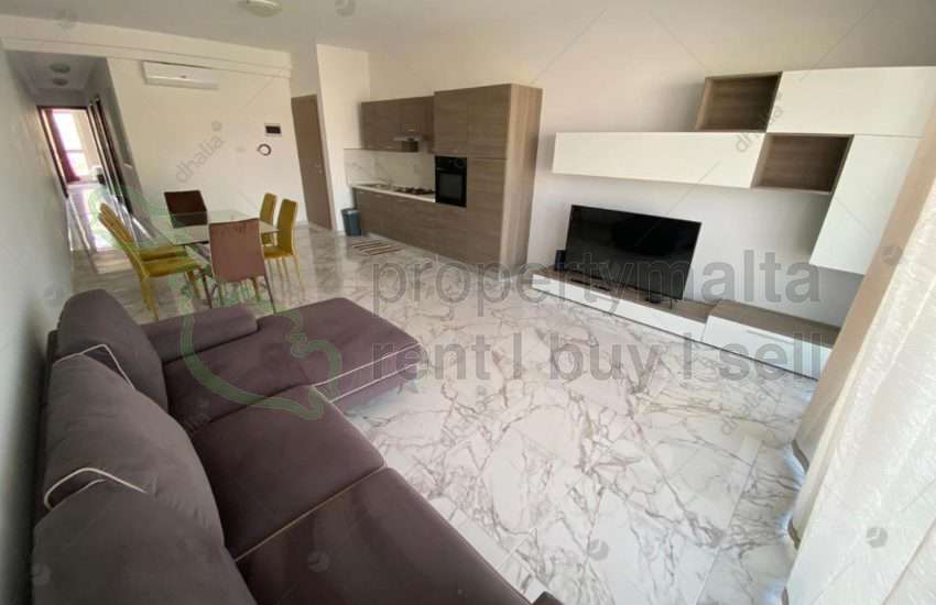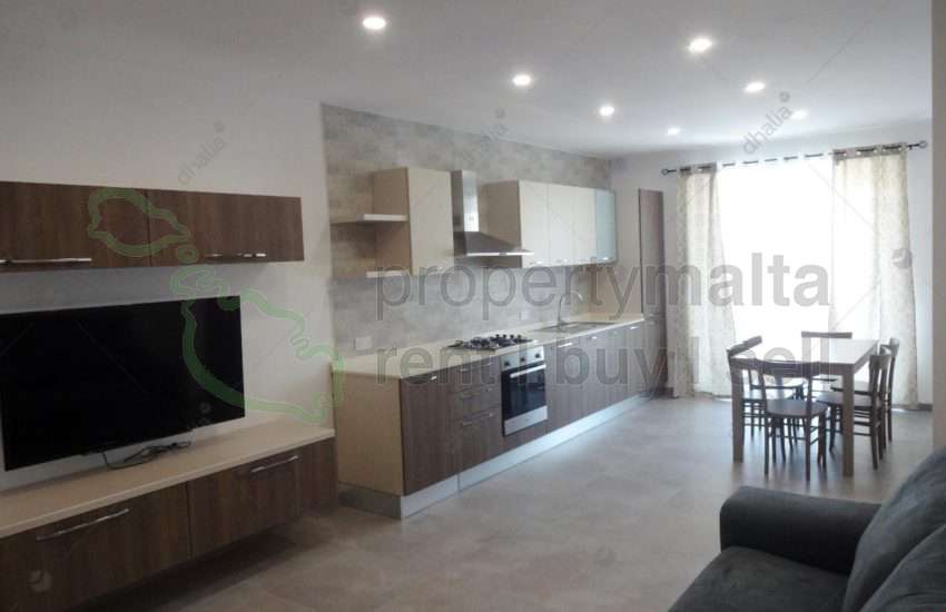 Brand new, first-floor apartment, facing a green area being offered fully furnished. Layout consists of an entrance into an open-plan kitchen/living/dining area, one double bedroom and one single bedroom, utility room, bathroom, toilet ensuite, front balcony, back terrace, enjoying distant sea views, laundry room and use of shared roof. Property is in a block of only two and includes cooker and fridge/freezer.