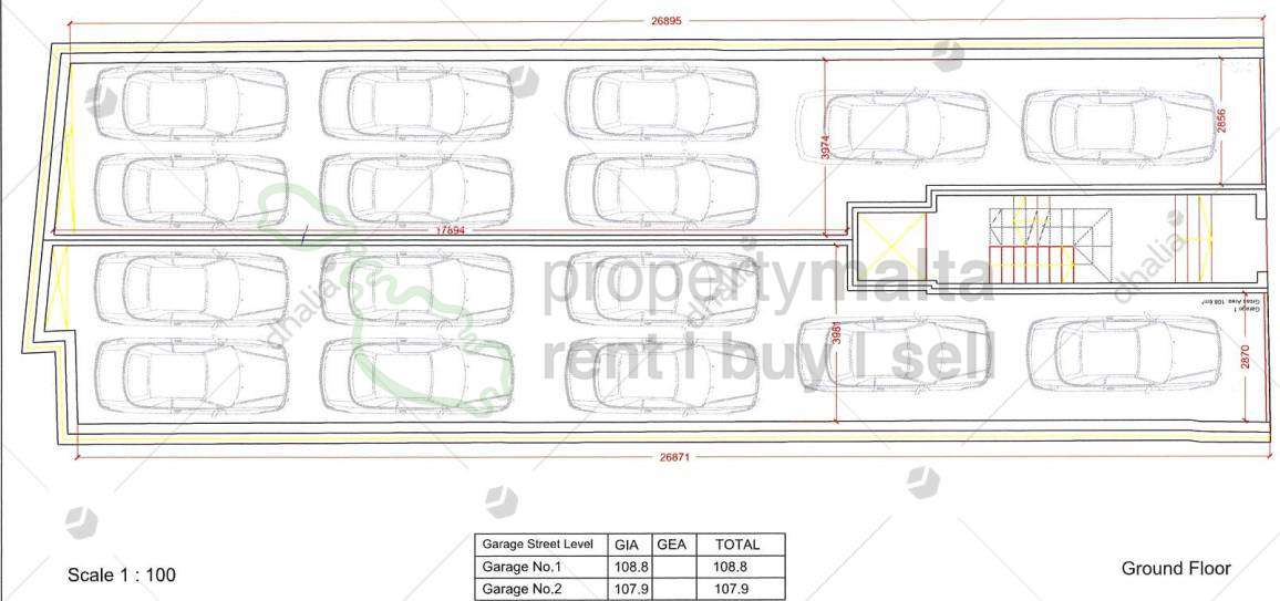 A spacious street-level garage covering approximately 217 square metres, with a capacity for 16 cars. The garage is fully finished, including facade, flooring, electrical and plumbing installations, and plastering. Ready for immediate use.