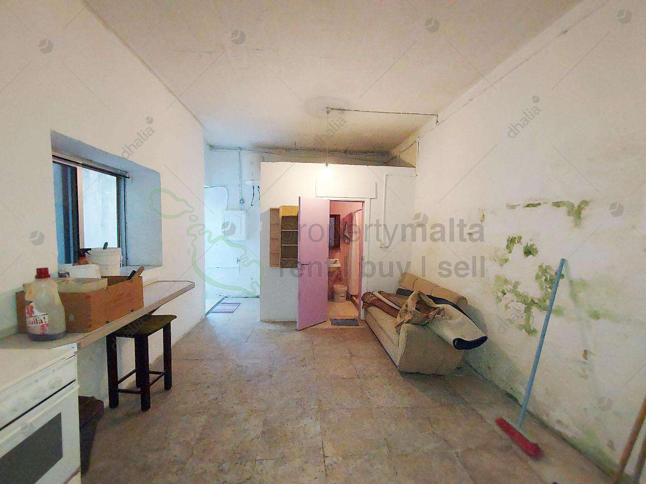 A one-bedroom maisonette in Fgura. The layout is in the form of an open-plan kitchen/living/dining area, double bedroom, study and main bathroom.