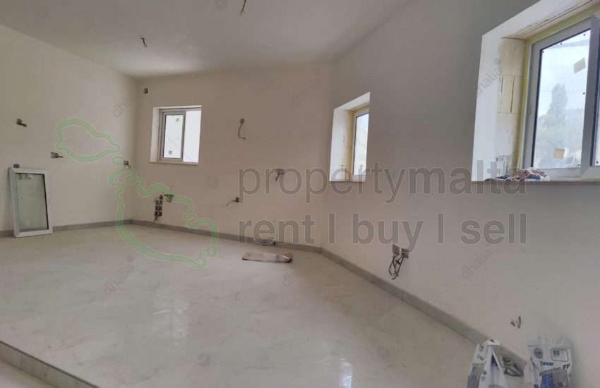 Hamrun, unconverted maisonette with permits in hand. The layout consists of an open-plan kitchen/living/dining area, three bedrooms, and three bathrooms.