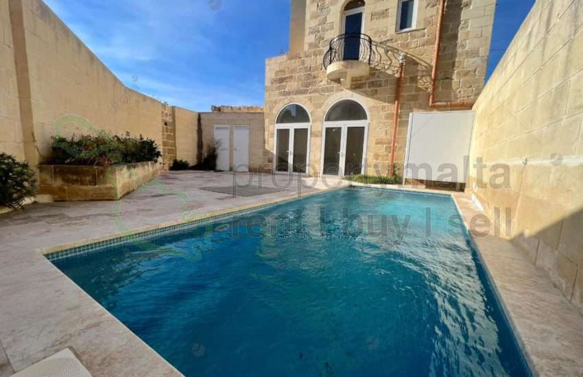 A converted house of character in Gharghur comprising an entrance hall, dining/living room, separate kitchen, cellar, three double bedrooms, main with en suite facilities, two bathrooms, a one-car garage included and a three-car garage available as an option. The property includes solar heaters and can be rented out furnished or unfurnished.