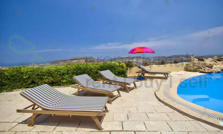 This superb property is set in an elevated position commanding incredible views of the island (almost 360 degrees). The property has been renovated to the highest standards and is ideally situated to enjoy the welcoming summer breeze. The modern, fitted kitchen is open plan with the dining and the lounge areas boasting large picture windows to enjoy the view. The large pool has a rockery with a waterfall. The whole property is enclosed by a wall for privacy and there is a covered terrace area with dining furniture for alfresco dining. The accommodation consists of one double bedroom with a four-poster bed, two twin bedrooms, one bathroom with a Jacuzzi bath, one spare toilet and shower room, and a combined kitchen/dining/living area. Drive-in carport.