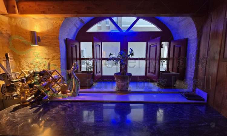 Expertly converted and fabulous, fully furnished one bedroom house of character in Qawra. This truly unique property consists of a large front yard and surrounding the property, On the ground floor, one finds an open plan kitchen, living, dining and a guest toilet. A Staircase takes you to the the upper mezzanine floor, consisting of a landing, main bathroom and a double bedroom. Distant sea views and freehold. Optional three car garage €100,000