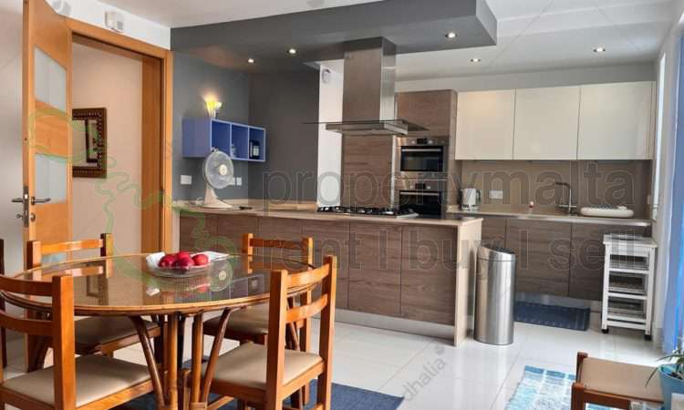 Qawra – Luxury finished & furnished maisonette, located just a few minutes walk to the Qawra Promenade, restaurants & coffee shops. Upon entering one finds an open plan with a formal dining & living room boasting lots of natural light and leading to a spacious front terrace, the master bedroom, spare bedroom (comprising two single beds), a single bedroom, two guest shower rooms, laundry room and an open plan kitchen/dining room leading to another back terrace equipped with outdoor kitchen / BBQ area & furniture. The maisonette is further complemented by distance sea views. To compliment this property, which is the perfect place to call home, one will enjoy the benefits of an RO System, Hydro Massage Shower, Bulgar Alarm, fully air-conditioned & much more. A perfect home away from home. Viewings are highly recommended!