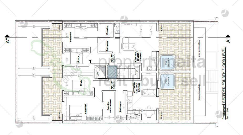 Fourth-floor, two-bedroom penthouse in Birkirkara. The layout consists of an open-plan kitchen/living/dining area leading to a front terrace, a main bathroom, two bedrooms with the main having an ensuite shower, and a back terrace. Optional, interconnected garages are also available.