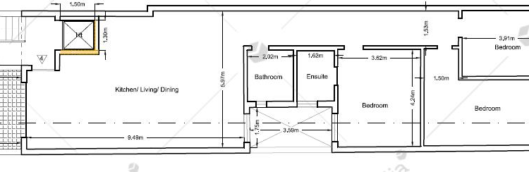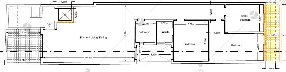 A fourth-floor, ready-built, penthouse having its own airspace measuring approximately 157 square metres (135 sqm int/22 sqm ext). The layout comprises a large open plan kitchen/living/dining leading to a front terrace, a main bathroom, a master bedroom with an ensuite, another two bedrooms, and a back terrace. Freehold.