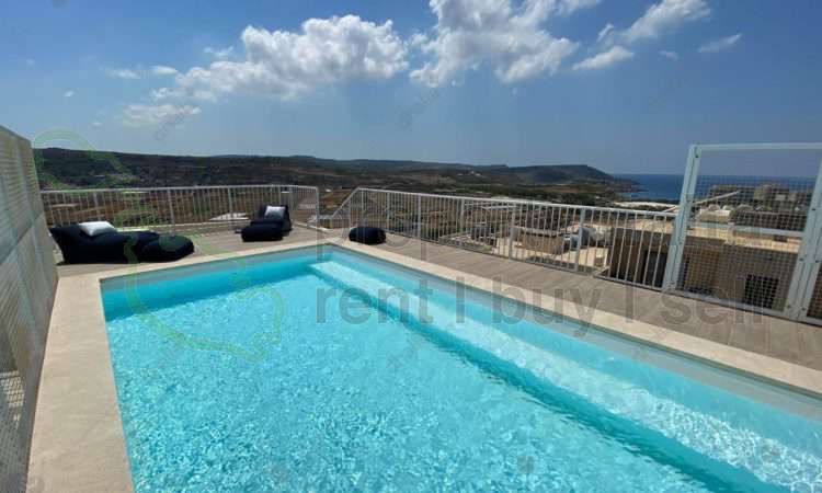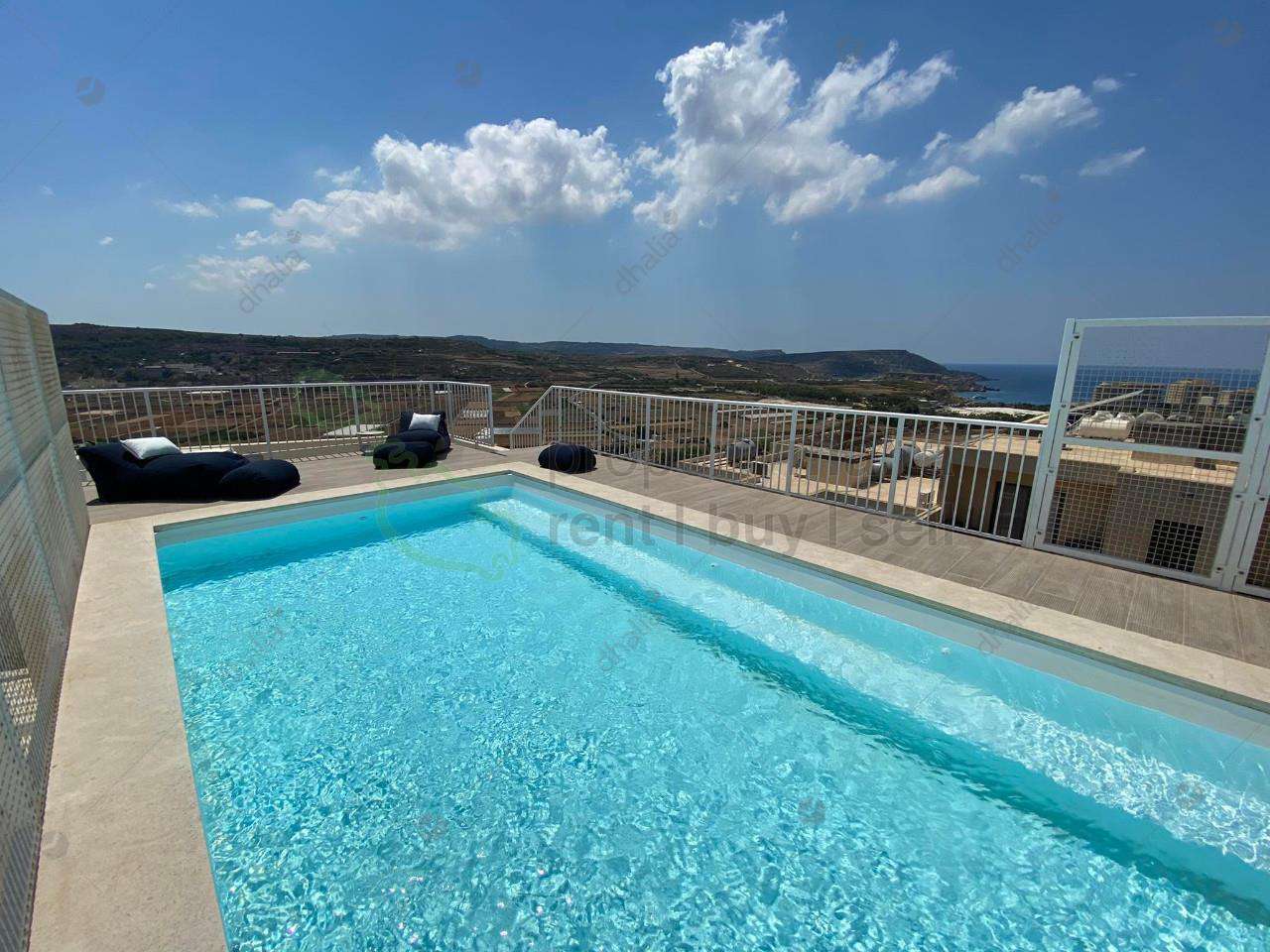 Luxurious, finished and furnished, two-bedroom, fully air-conditioned penthouse with a swimming pool in Manikata. The layout consists of a large open-plan (equipped with a dishwasher), dining area, main bathroom guest toilet, laundry room, large living area and two double bedrooms. Served with a lift