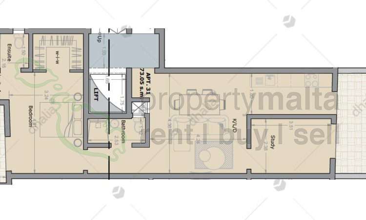 Pieta, a two-bedroom penthouse being sold in shell form, consisting of an open-plan kitchen/living/dining area leading to a front terrace, main bathroom, two bedrooms, with the main bedroom having an ensuite shower and a walk-in wardrobe.