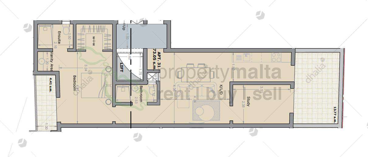 Pieta, a two-bedroom penthouse being sold in shell form, consisting of an open-plan kitchen/living/dining area leading to a front terrace, main bathroom, two bedrooms, with the main bedroom having an ensuite shower and a walk-in wardrobe.