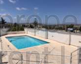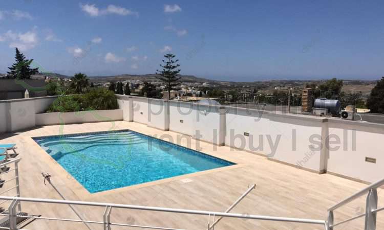 Street-level semi-detached bungalow plot measuring 750 square metres, fully equipped and finished to the highest of standards in 2017. This property is set on two levels, living quarters at street level set on an open-plan layout comprising a beautiful kitchen with a large island and combined separate dining room, large living room, storage room, a study and guest toilet. Interconnecting two-car garage and large driveway. All rooms have wide apertures and enjoy plenty of natural light and country and distant sea views throughout. Kitchen/living and dining rooms lead onto two sizeable west-facing terraces with views that enjoy sunsets all year round. The lower level comprises four bedrooms all with ensuite bathrooms and three of these bedrooms have walk-in wardrobes, a large laundry room and a storage room. The beautiful pool area has ample deck space, large pool with jacuzzi, lovely side garden and pool shower. This property is fitted with double-glazing apertures throughout, intercom and CCTV; alarm system; Siemens solar water heater installed on the roof.
