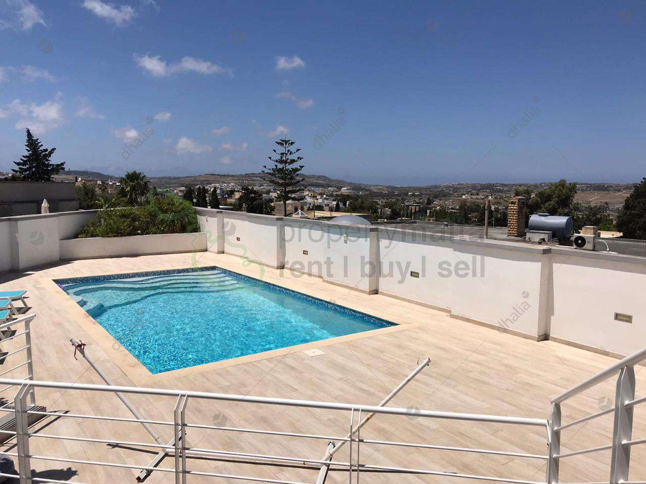 Street-level semi-detached bungalow plot measuring 750 square metres, fully equipped and finished to the highest of standards in 2017. This property is set on two levels, living quarters at street level set on an open-plan layout comprising a beautiful kitchen with a large island and combined separate dining room, large living room, storage room, a study and guest toilet. Interconnecting two-car garage and large driveway. All rooms have wide apertures and enjoy plenty of natural light and country and distant sea views throughout. Kitchen/living and dining rooms lead onto two sizeable west-facing terraces with views that enjoy sunsets all year round. The lower level comprises four bedrooms all with ensuite bathrooms and three of these bedrooms have walk-in wardrobes, a large laundry room and a storage room. The beautiful pool area has ample deck space, large pool with jacuzzi, lovely side garden and pool shower. This property is fitted with double-glazing apertures throughout, intercom and CCTV; alarm system; Siemens solar water heater installed on the roof.